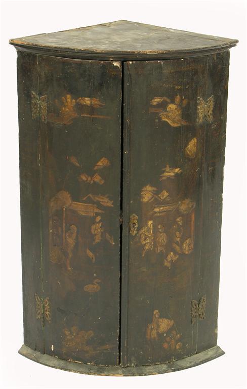 A George II Japanned hanging corner cupboard, decorated chinoiserie scenes with a later painted interior, distressed, 36.5in (92.5cm) h, 23.25in (59cm) w, 16in (40.5cm) d.