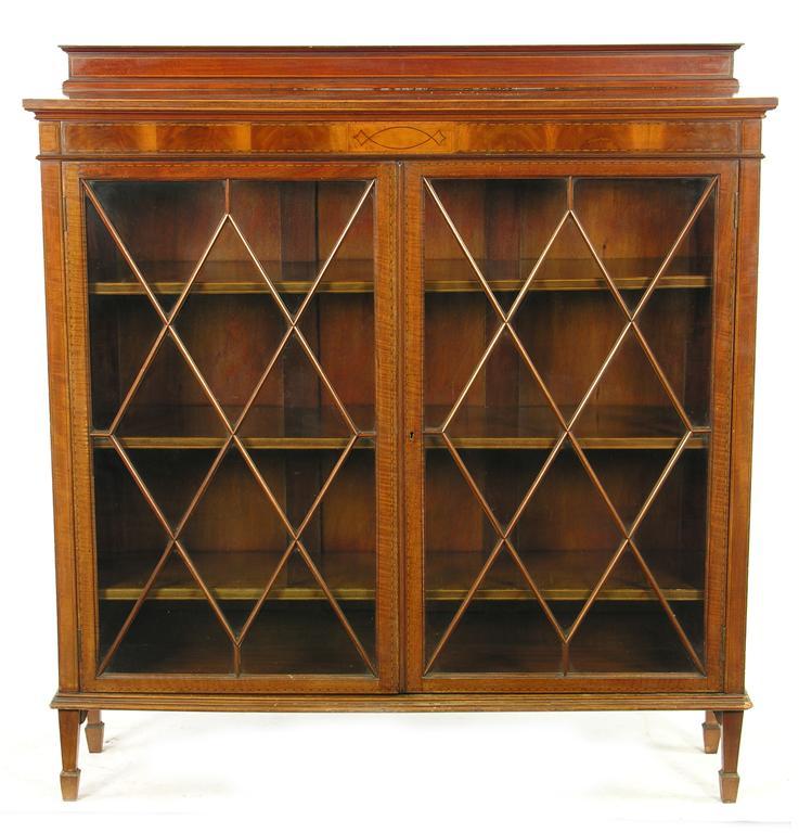 A mahogany cabinet, with stringing and a pair of astragal glazed doors enclosing adjustable shelves on tapering legs to pad feet, 1st quarter 20th century, 51in (129.5cm) h, 48in (122cm) w, 12.5in (32cm) d.