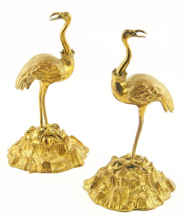 A pair of 19th century models of cranes, raised on weighted rocky bases, each with a crown around its' neck, both bases and beaks drilled, possibly converted to gas,10.75in (27cm) h. (2) Thomas Abbott produced similar models with candle sconces.