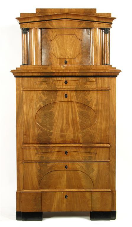 A 19th century Austrian mahogany secretaire a abattant, with ebonised moulding, the architectural stepped pediment above a panelled bowfront door flanked by columns, above a drawer and a fall with lead weights to a stepped interior with central cupboard door flanked by pigeon holes and drawers above three further long drawers to block feet, 76in (193cm) h, 39in (99cm) w, 20.5in (52cm) d. Cracks to both sides of the top with veneer loss to cupboard door and below.