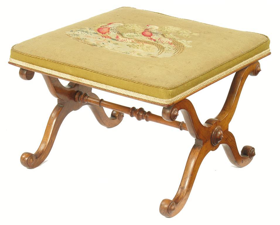 An early Victorian rosewood X frame stool, the needlework top depicting two golden pheasants, 18in (46cm) h, 24.5in (62cm) square.