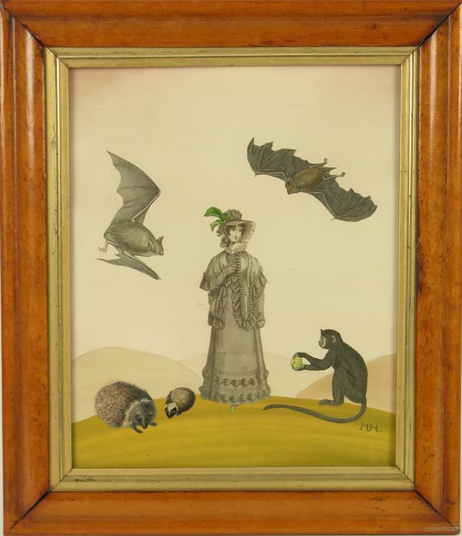 M.H. Marching monkey's and Victorian lady with bats, monkey and hedgehogs, collage and watercolour, signed with initials, 12.5 x 10in (32 x 15.5cm) and another, oval with owl, moths and bettle playing a violin. (3)