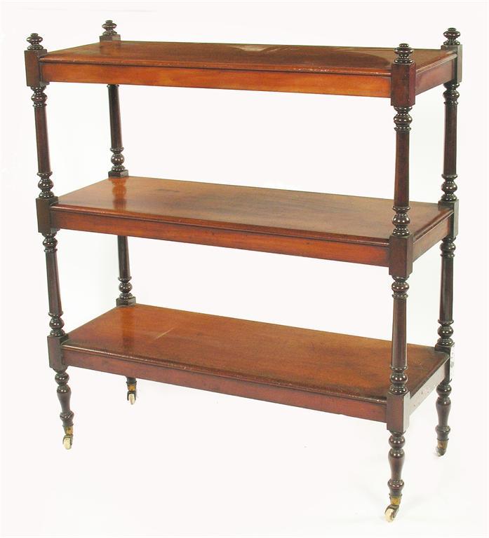 A Victorian mahogany three tier buffet, with turned support and finials, the castors stamped 'Cope & Collinson Patent', 47in (119cm) h, 42in (106.5cm) w, 16in (40.5cm) d.
