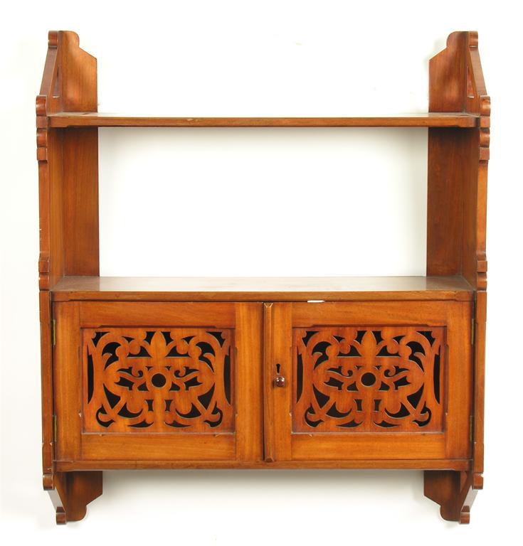 A late Victorian mahogany hanging shelf, with a pair of pierced panel cupboard doors, 31.25in (79.5cm) h, 26.25in (66.5cm) w, 7.5in (18.5cm) d.