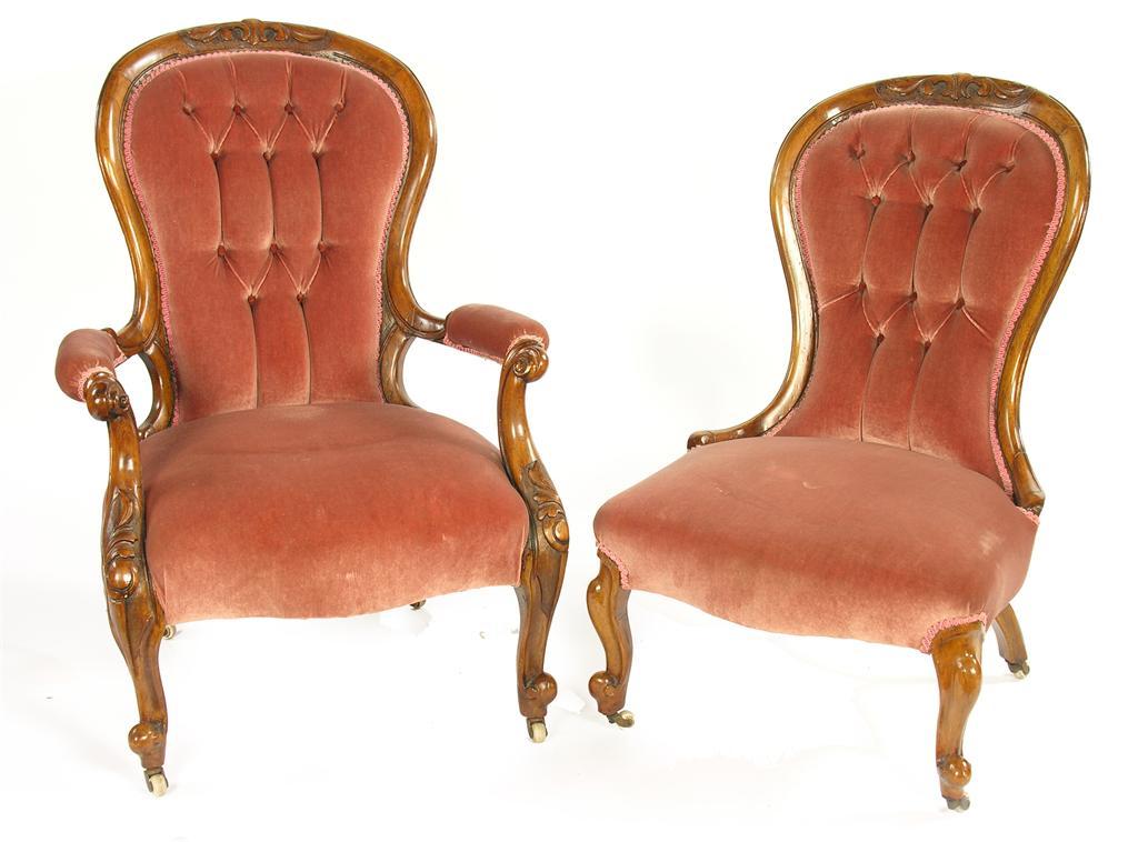 A Victorian carved walnut show frame open armchair, and a matching nursing chair. (2)
