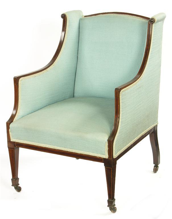 An Edwardian mahogany easy armchair, with stringing and ceramic castors.
