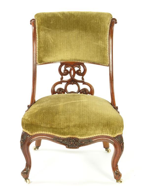 A Victorian carved walnut show frame easy chair, the padded back with a pierced foliage scroll splat, the serpentine front seat on cabriole legs to ceramic castors.