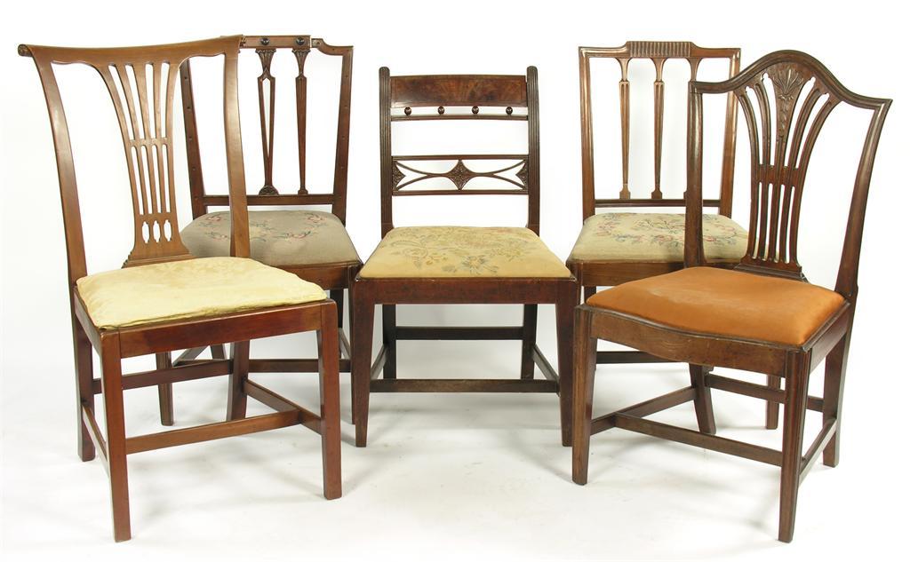 A George III mahogany side chair, with a pierced vase shape splat carved honeysuckle to a serpentine drop-in seat on square tapering moulded legs and four other mahogany side chairs of differing designs, 19th/20th century. (5)