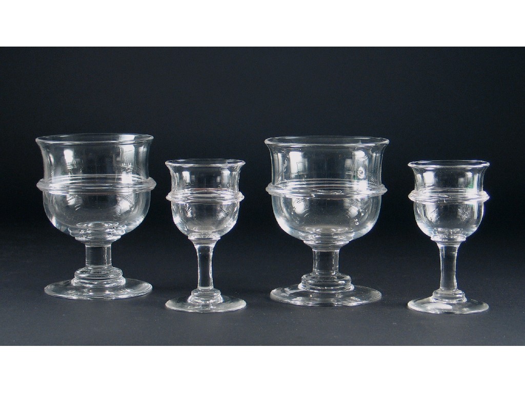 A set of six wine glasses, with single bands to the rounded bowls and six matching smaller glasses. (12)