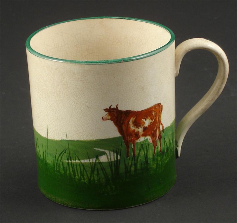 A Wemyss pottery mug painted with a cow in a landscape