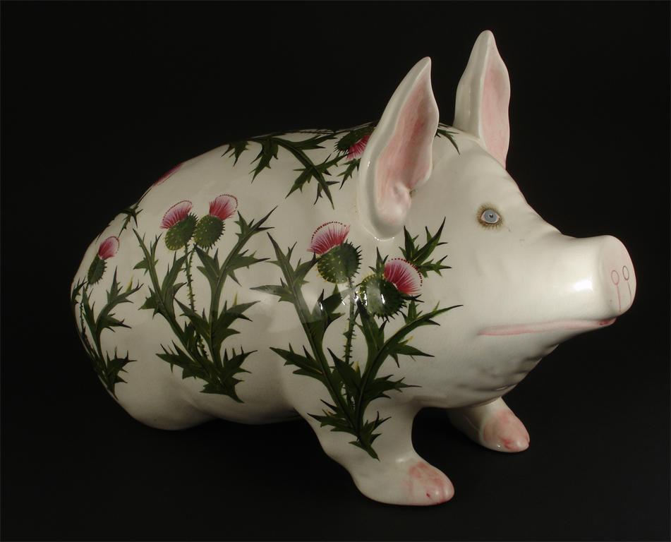 A large Plichta pottery pig designed by Joseph Nekola, painted with thistles in shades of pink, green and yellow on a white ground printed and painted marks 45cm. long