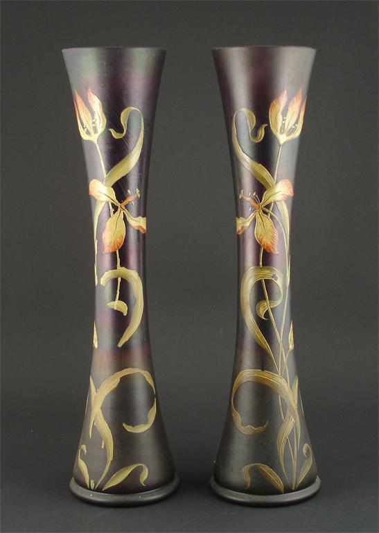 A pair of Art Nouveau tall enamelled glass vases purple glass enamelled with tulips