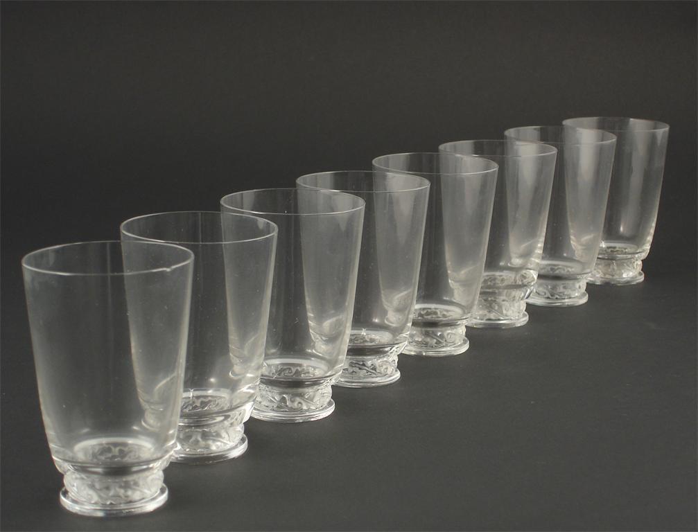 Eight Modern Lalique clear and frosted glasses with simple scrolling foliage band etched Lalique...
