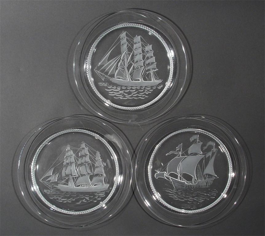 Three Modern Lalique clear and frosted glass plates each decorated with a ship at full sail...