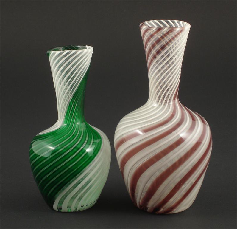 Two Italian glass vases in the style of Dino Martens, decorated with alternating, twisted aubergine, green and white stripes unsigned tallest 16cm. high