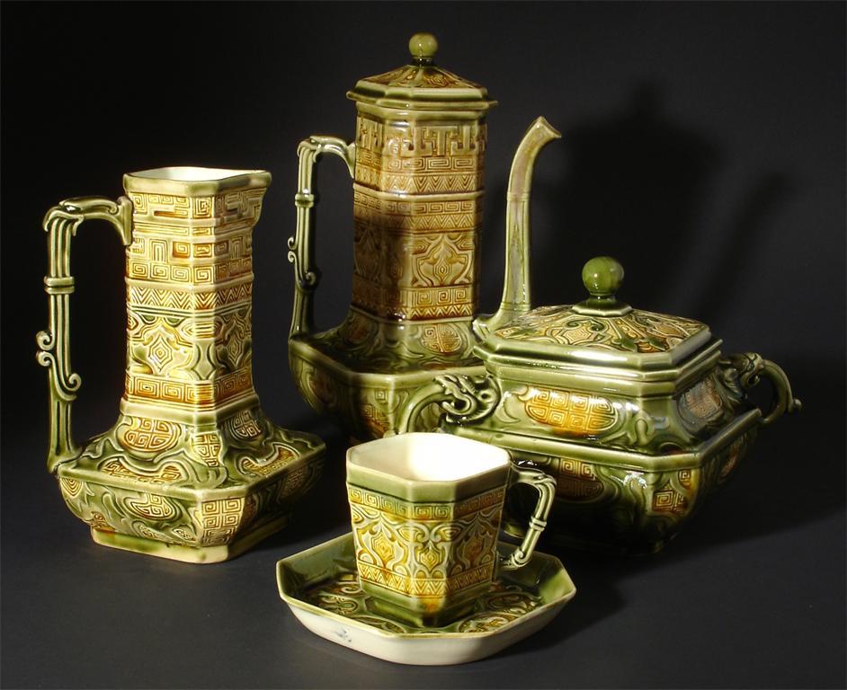 A Choisy Le Roi, French Aesthetic Movement coffee set modelled in low relief with panels of geometric decoration, the handles with grotesques, in shades of green and ochre, comprising, coffee pot and cover, milk-jug, sugar basin and cover, six cups and saucers printed and impressed marks, minor damages, coffee pot 24cm.high
