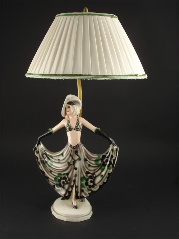 A Goldscheider Pottery lampbase by Dakon, model no.82 2020, painted in colours, with fittings and modern shade printed and impressed marks and facsimile signature, repair to back of base 33cm. high