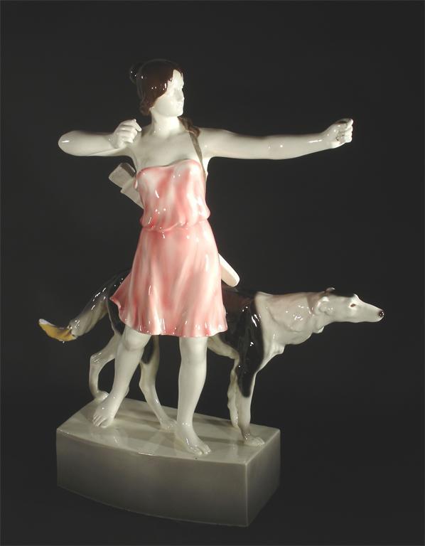 A large Goldscheider figure of Diana designed by Louis Marie Latour, model no.4310, painted in colours, impressed marks, artist signature, repaired tail, missing bow 59cm. high Literature Ora Pinhas Goldscheider Richard Dennis page 105 for a comparable example