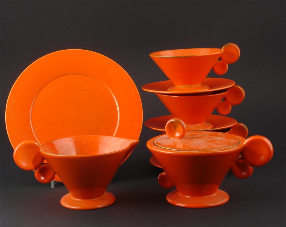 A Hael Werkstatten earthenware tea set designed by Greta Marks, covered in a rich orange glaze, comprising; milk-jug and covered sugar bowl, seven cups, seven saucers and six side plates printed monogram milk-jug 7.5cm. high