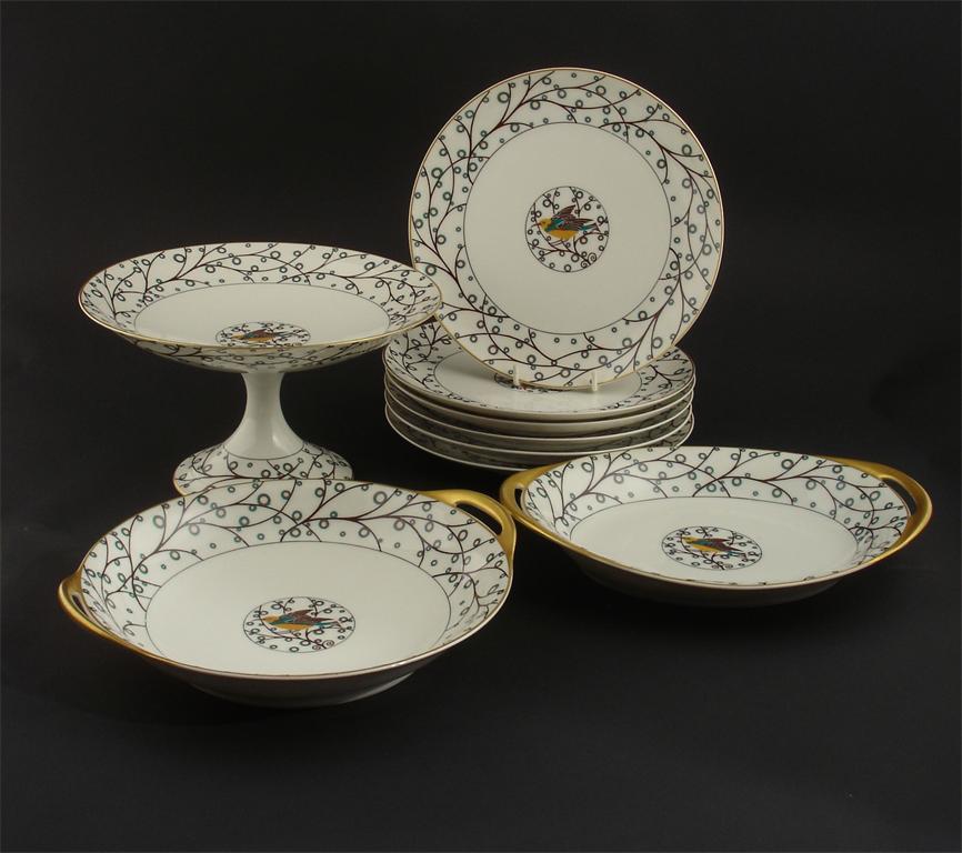 A Haviland, France Art Deco part service painted with a bird perched in a tree with stylised foliage, in shades of brown, blue and yellow highlighted in gilt, comprising, tazza, two twin-handled dishes and six plates printed marks plates 22cm. diam.