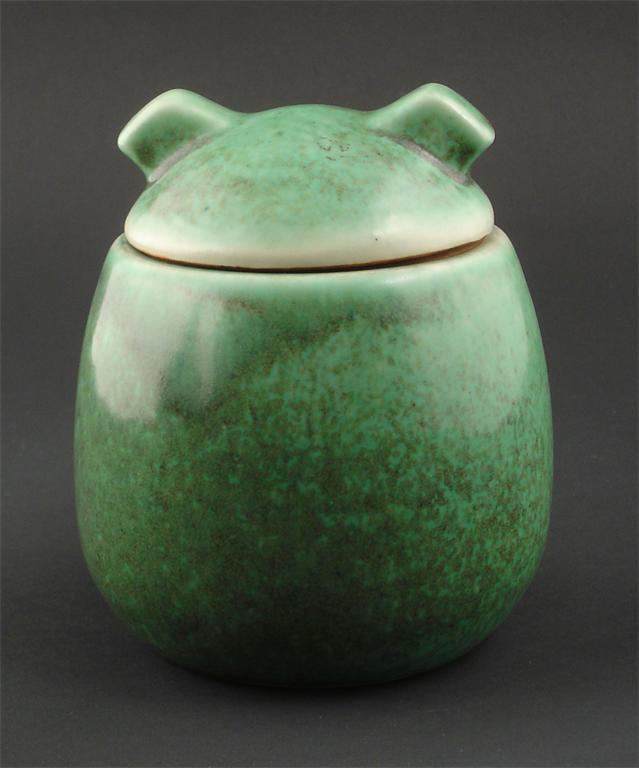 A Saxbo, Denmark stoneware jar and cover by Erik Rahr, covered in a mottled green glaze impressed marks, ER monogram 17cm. high