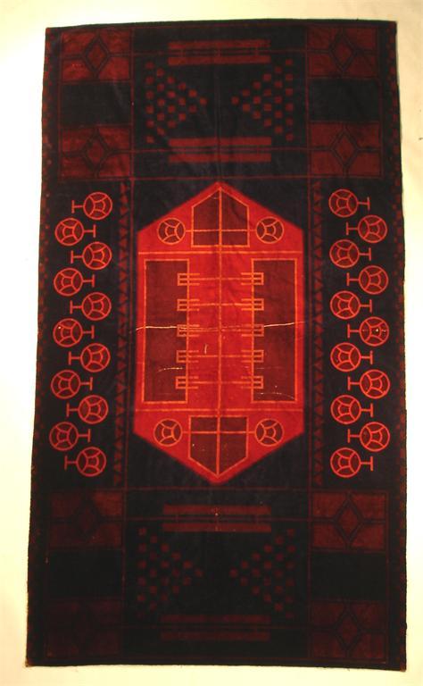 A plush velvet cover in the style of Peter Behrens, decorated with stylised flower stems and panels of geometric patterns, in red on a blue ground unsigned 288 x 160cm.