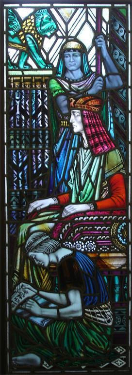 An Arts and Crafts stained glass panel probably by the Gateshead Stained Glass Company, depicting a Persian king seated on his throne, with attendants 152 x 52cm.