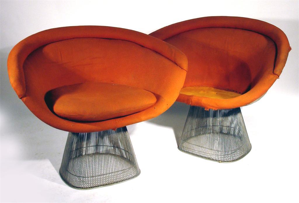 A pair of Knoll International nickel plated arm chairs designed by Warren Platner, model number 1725A, upholstered in orange unsigned, one cushion missing 97cm. wide, 77cm high Literature Charlotte and Peter Fiell 1000 Chairs, Taschen page 340-341 for a comparable example