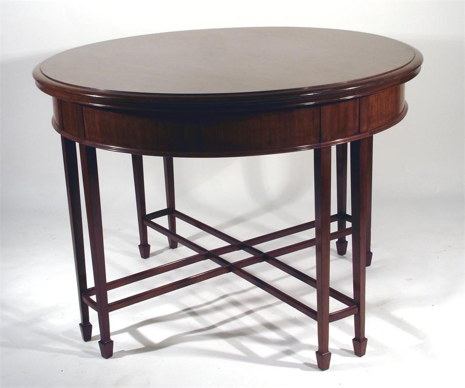 A Liberty & Co mahogany table, circular top with four paired legs stamped 121142 108cm high