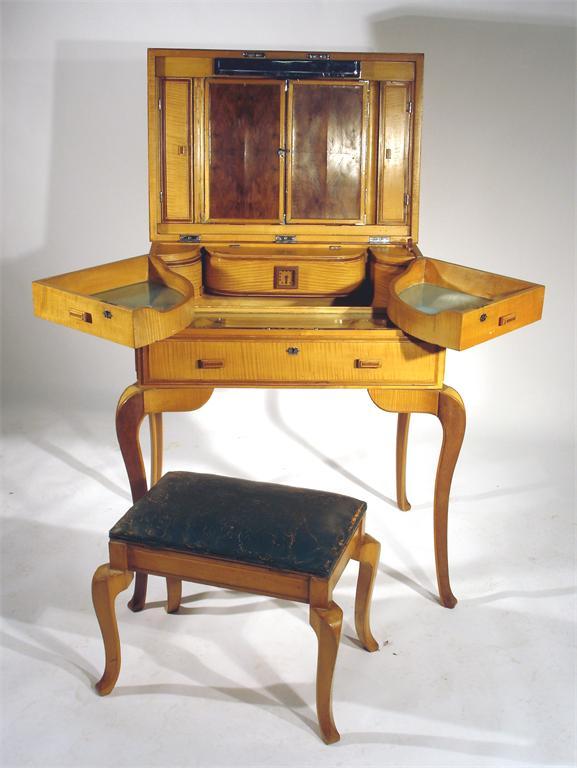 An English Art Deco satinwood veneer dressing table and stool opening to show