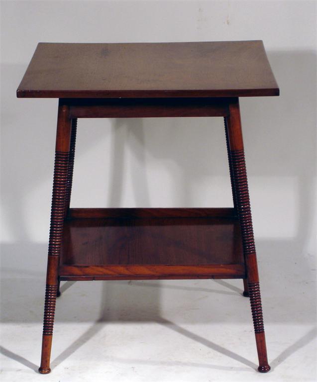 A Liberty & Co oak side table on turned flaring legs applied metal label 62cm. high