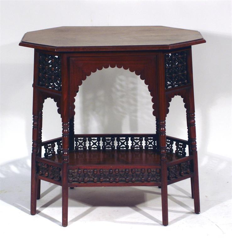 A Liberty & Co Moorish mahogany table octagonal section, with musharabeyeh panels, impressed Liberty marks 67cm. high
