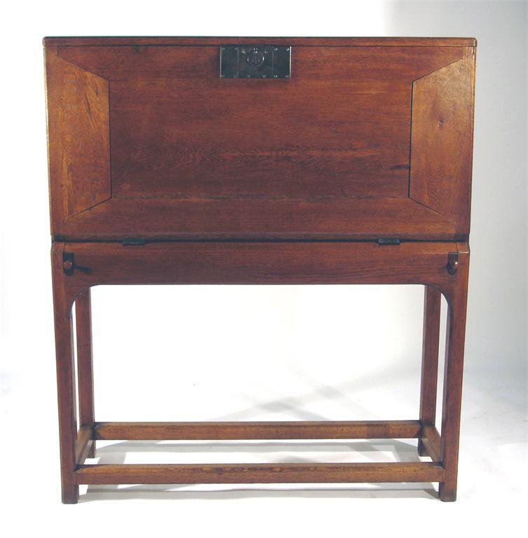 A Cotswolds School Arts and Crafts oak bureau, fitted interior, the burnished steel lock plate dated 1926 unsigned 114cm wide, 131cm. high