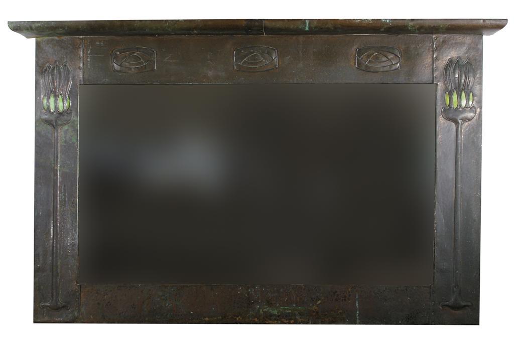 A large Glasgow School patinated copper overmantel mirror with three stamped Glasgow Rose motif
