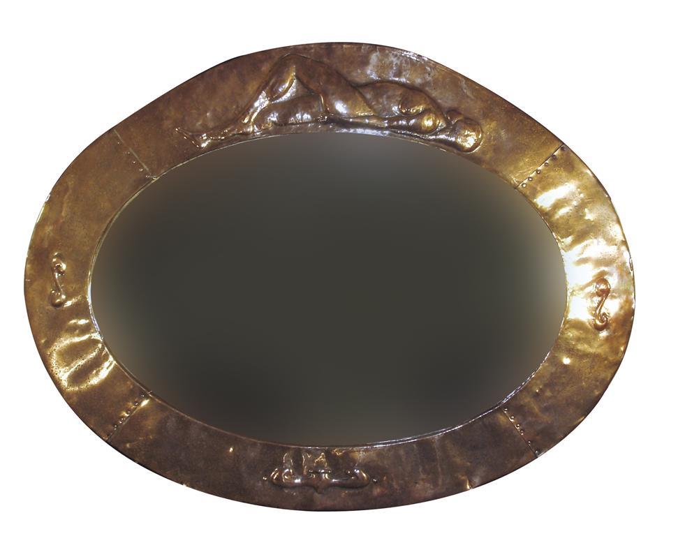 A large Arts and Crafts copper mirror elliptical form, cast in relief with a draped naked figure unsigned 93cm. wide