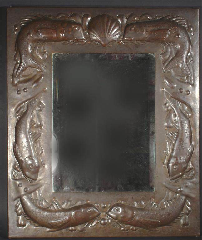 A Newlyn patinated copper mirror hammered in relief with a frieze of fish