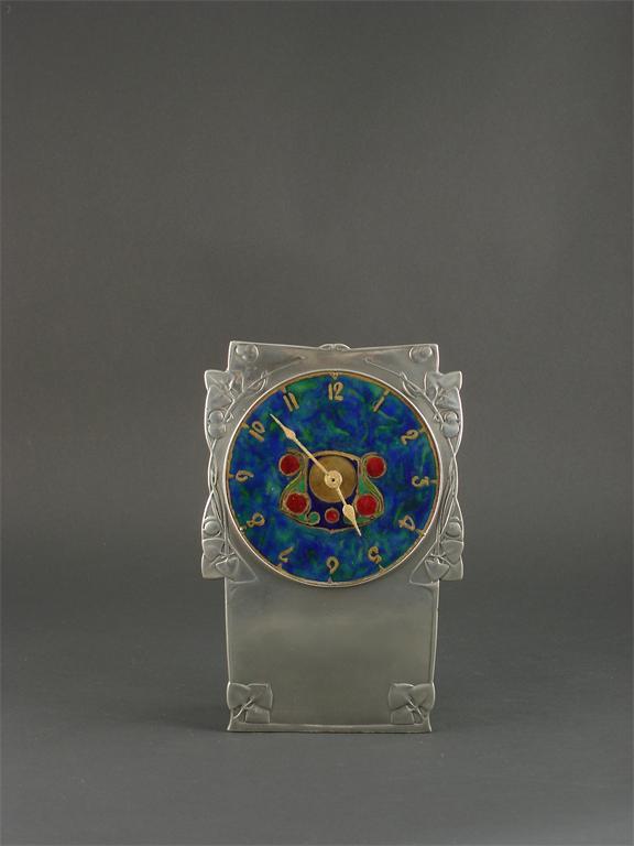 A Liberty Pewter and enamel mantel clock model no. 0609 designed by Archibald Knox, stamped marks 20.5cm. high Literature Stephen A Martin Archibald Knox, ARTMEDIA, page 233 for a comparable example