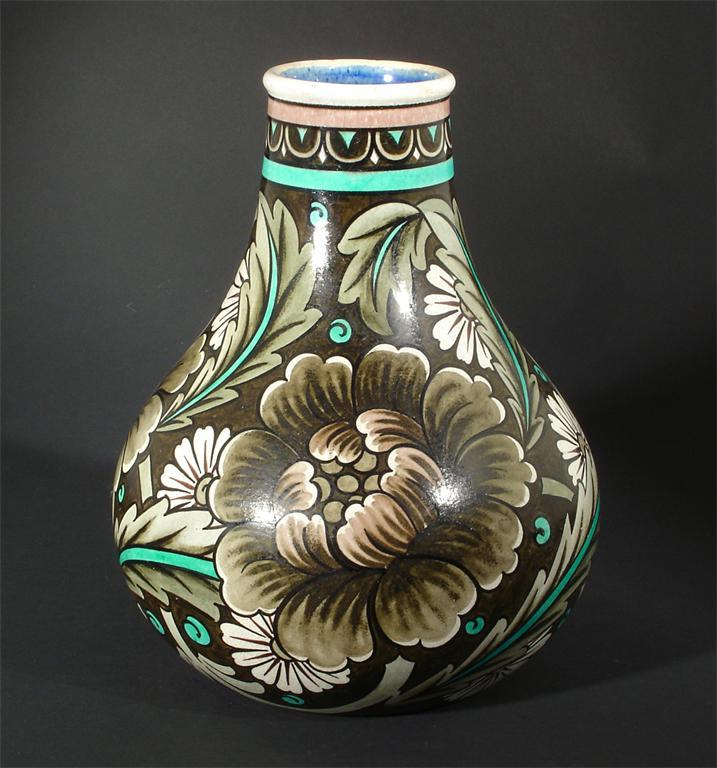 A Burmantoft's Faience Persian vase designed by Leonard King, design 85 painted in colours on a brown ground impressed marks, painted monogram, minor glaze loss 25cm. high