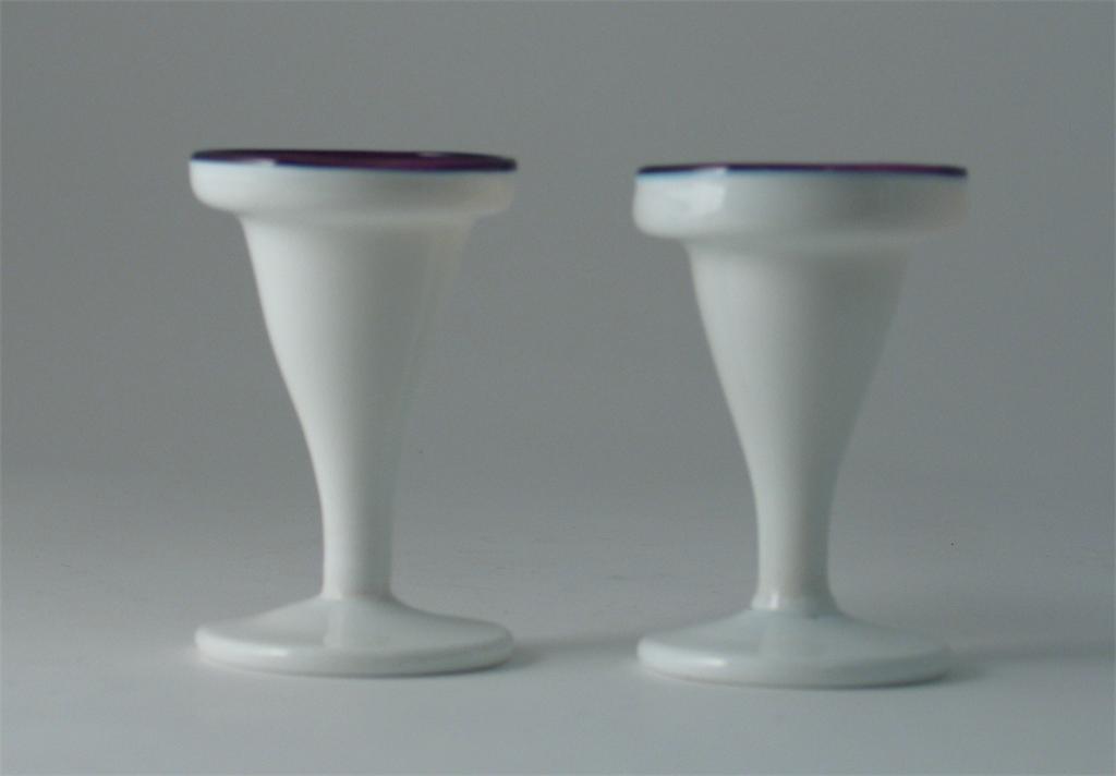 A pair of opaque white glass vases or eggcups, with conical bodies, the rims applied with amethyst bands, 18th century, 8.3cm. (2)