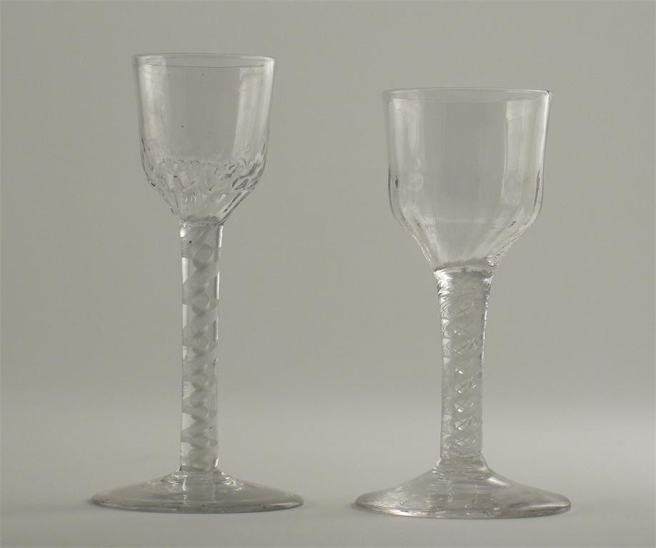 Two wine glasses, with moulded bowls and opaque twist stems, c.1770, 15cm. max. (2)