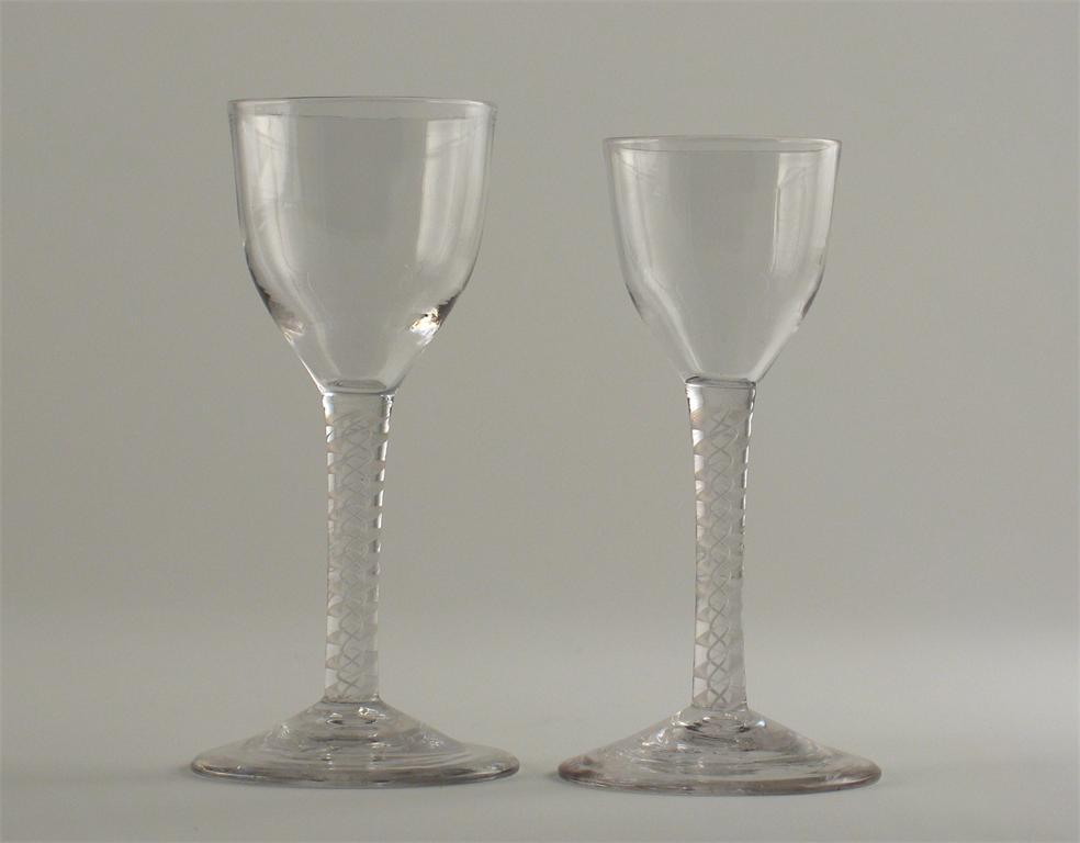 Two wine glasses, with plain bowls and double series opaque twist stems, c.1770, 15.5cm. (2)