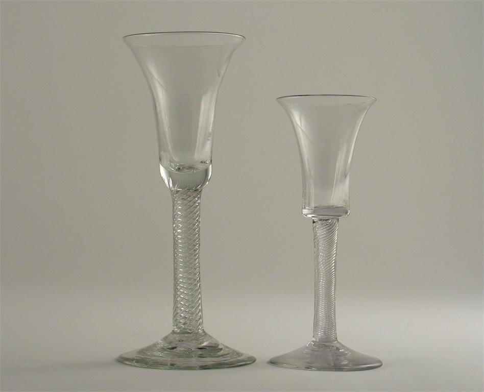 Two wine glasses, with trumpet bowls and air twist stems, 18.2cm max. (2)