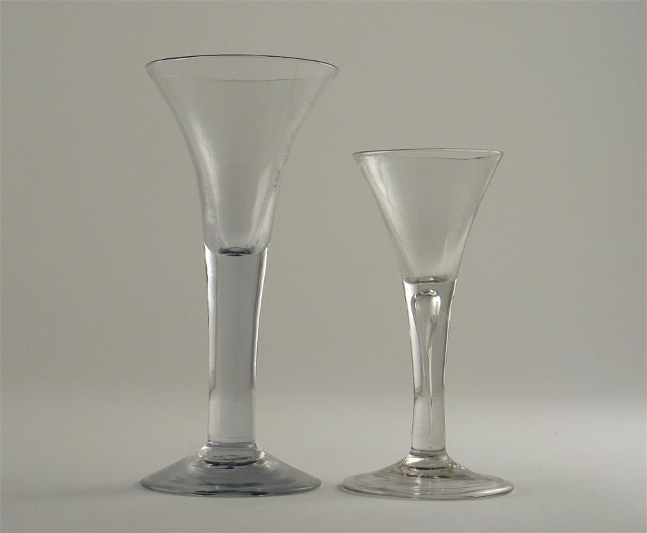 Two wine glasses, with trumpet bowls and plain stems, one with a folded foot. 18th century, 17.6cm. max. (2)