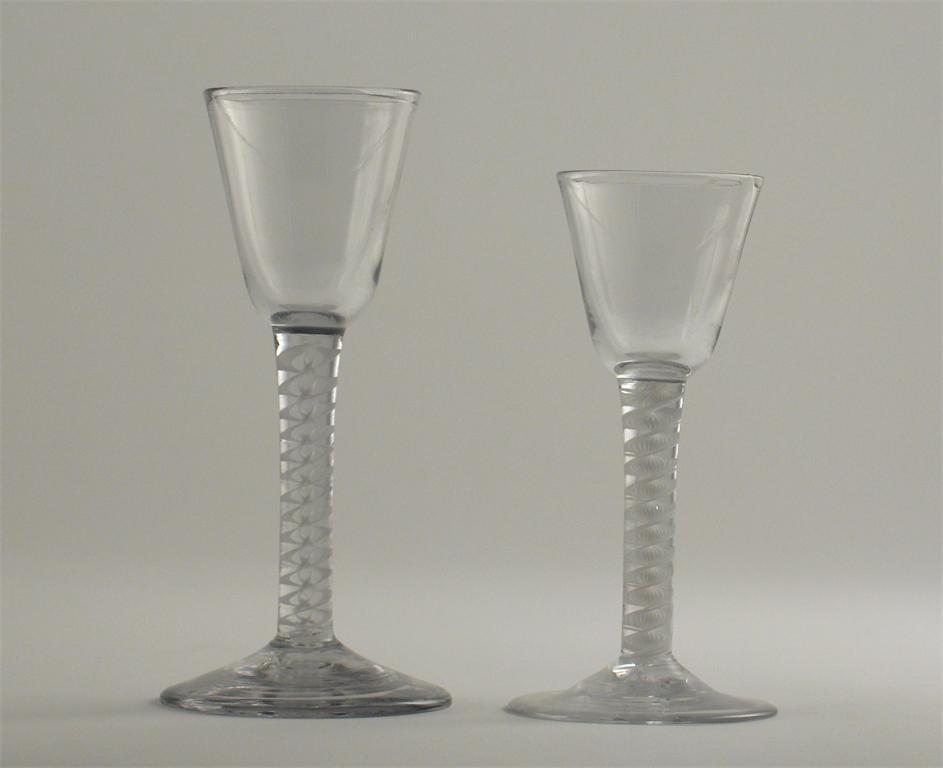 Two wine glasses, with plain bowls and opaque twist stems, 18th century, 15cm. (2)
