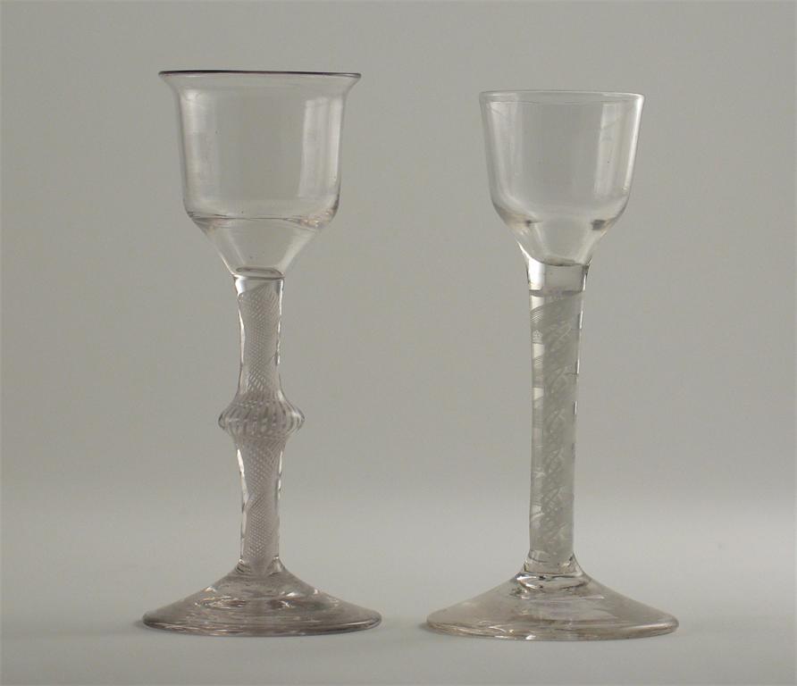 Two wine glasses with plain bowls, one stem knopped, both with opaque twist stems, c.1770, 14.5cm. (2)