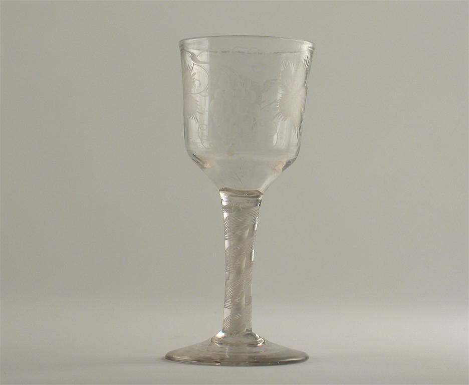 A wine goblet, the bowl engraved with a bird to one side, and with grapes on a vine to the other, an opaque twist stem, c.1770, 18.5cm.