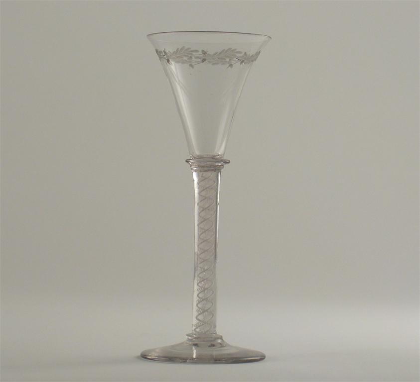 A wine glass, the bowl engraved with a border of oak leaves and acorns, on a multiple opaque twist stem, 18.2cm.