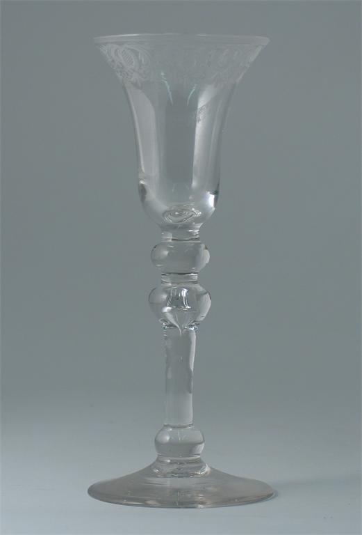 A wine glass, the bell-shaped bowl engraved with a band of stylized scrolls and foliage, on a high knopped stem, c.1760, 17.8cm.