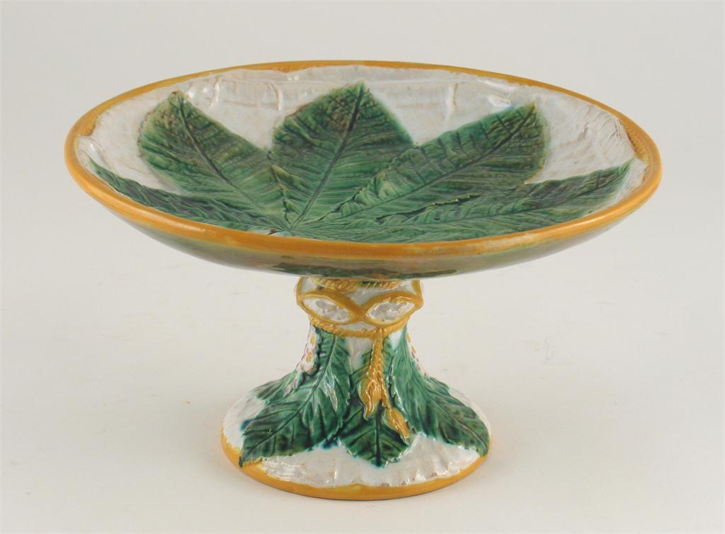 A Majolica tazza, moulded with a horse chestnut leaf, c.1870, 23cm.