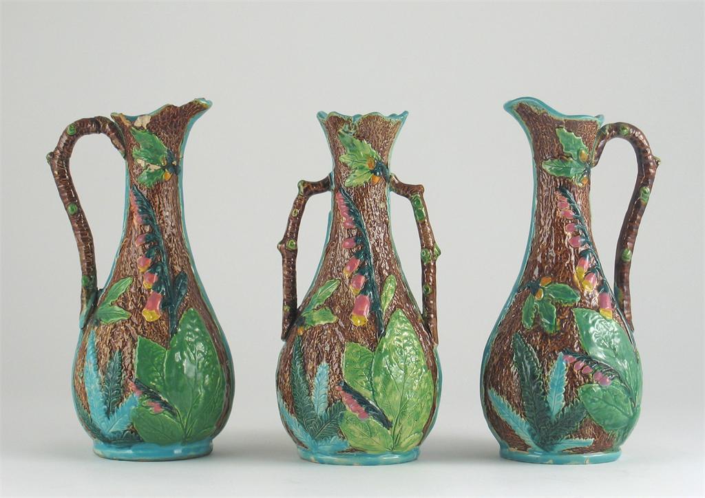 A set of two Majolica jugs and a matching vase